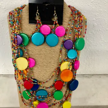 11-Strand Multi-Color Seed Bead Necklace with Graduated Multi-Color Wooden Accents & Matching Earrings quantity