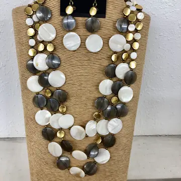 Turn heads with this 3-strand gold and shell necklace set, crafted with a mix of gold beads, natural shell, and black lip shell accents.