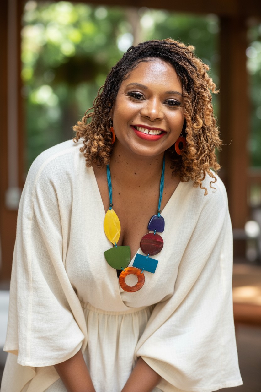 This turquoise wax cord necklace is a stunning mix of natural textures and tropical energy. Designed with multi-fall strands adorned with colorful wooden beads and shimmering shells, it adds movement and life to your look. The turquoise cord complements the earthy tones beautifully, while the layered structure gives it a statement-making presence. Handcrafted and lightweight, this set includes matching earrings — perfect for beachwear, summer outfits, or boho-inspired styles.