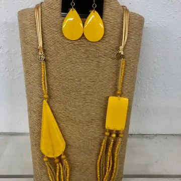 This yellow adjustable wax cord necklace is a vibrant expression of creativity and craftsmanship. Featuring eye-catching square and teardrop resin accents, it pairs cheerful yellow tones with a sleek, modern silhouette. The adjustable design ensures a perfect fit, while the lightweight structure makes it comfortable for all-day wear. Complete with matching earrings, this handcrafted set is ideal for boho, summer, or casual chic looks that radiate warmth and individuality.