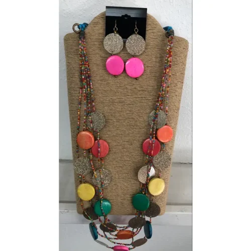 11-Strand Multi-Color Seed Bead Necklace with Graduated Multi-Color Wooden Accents & Matching Earrings