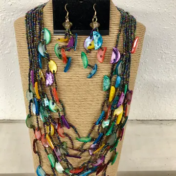 11-Strand Multi-Color Seed Bead Necklace with Graduated Multi-Color Wooden Accents & Matching Earrings